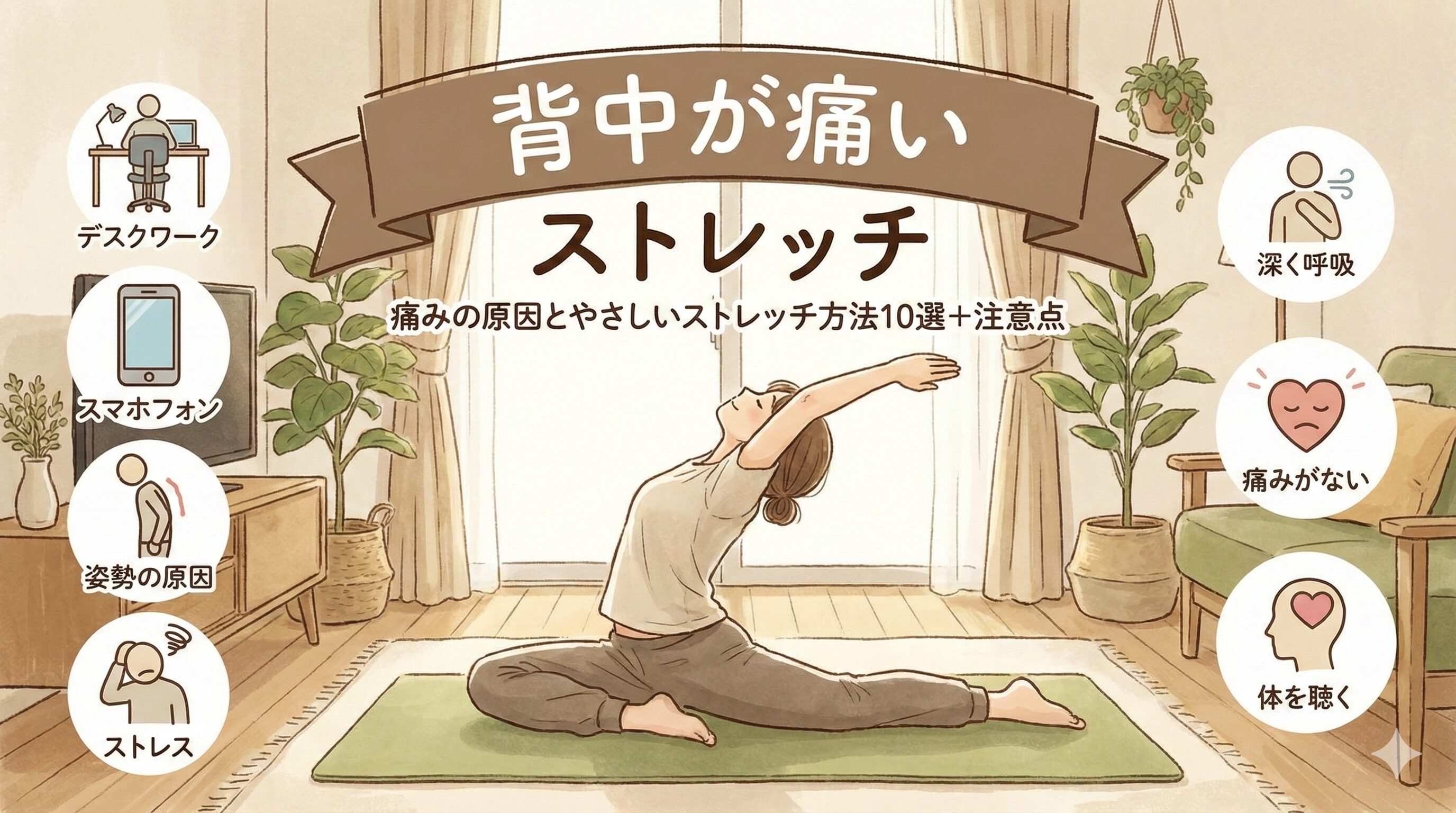 “背中が痛い ストレッチ”を探している方の多くは、強い運動ではなく今すぐ自宅でできるケアを求めていると言われています。参考記事でも、まずは背中全体をやさしく動かすことが大切と紹介されています(引用元:【⭐︎参考記事】https://asakusa.kinmaku-m.com/senaka-stretch)。