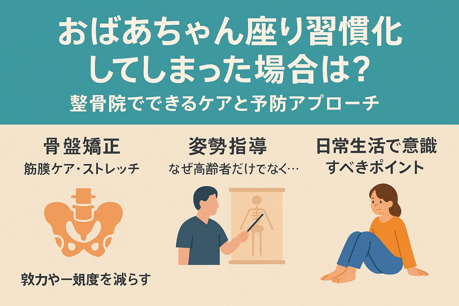 「若い頃は平気だったけど、最近ちょっと違和感が…」という人、意外と多いと思います。子どもの頃や若いうちは、股関節や膝の柔軟性があって、骨や筋肉も柔らかめ。だからおばあちゃん座りでも“楽”に感じやすいと言われています。asahi-minato.com+2グレフル鍼灸接骨院 整体院 心斎橋 | 輝く未来を創造するボディケアグループ+2