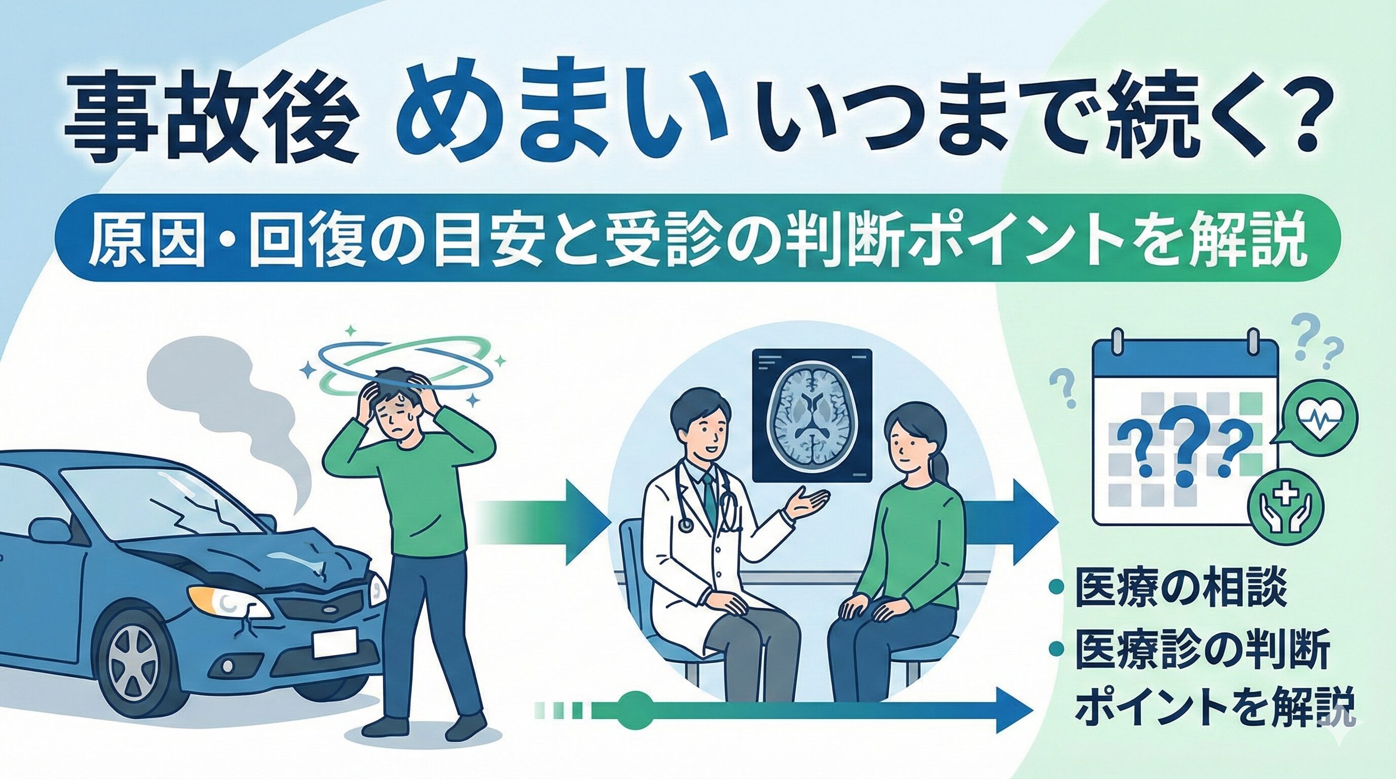 事故後のめまいが続くと、相談先に迷いますよね。