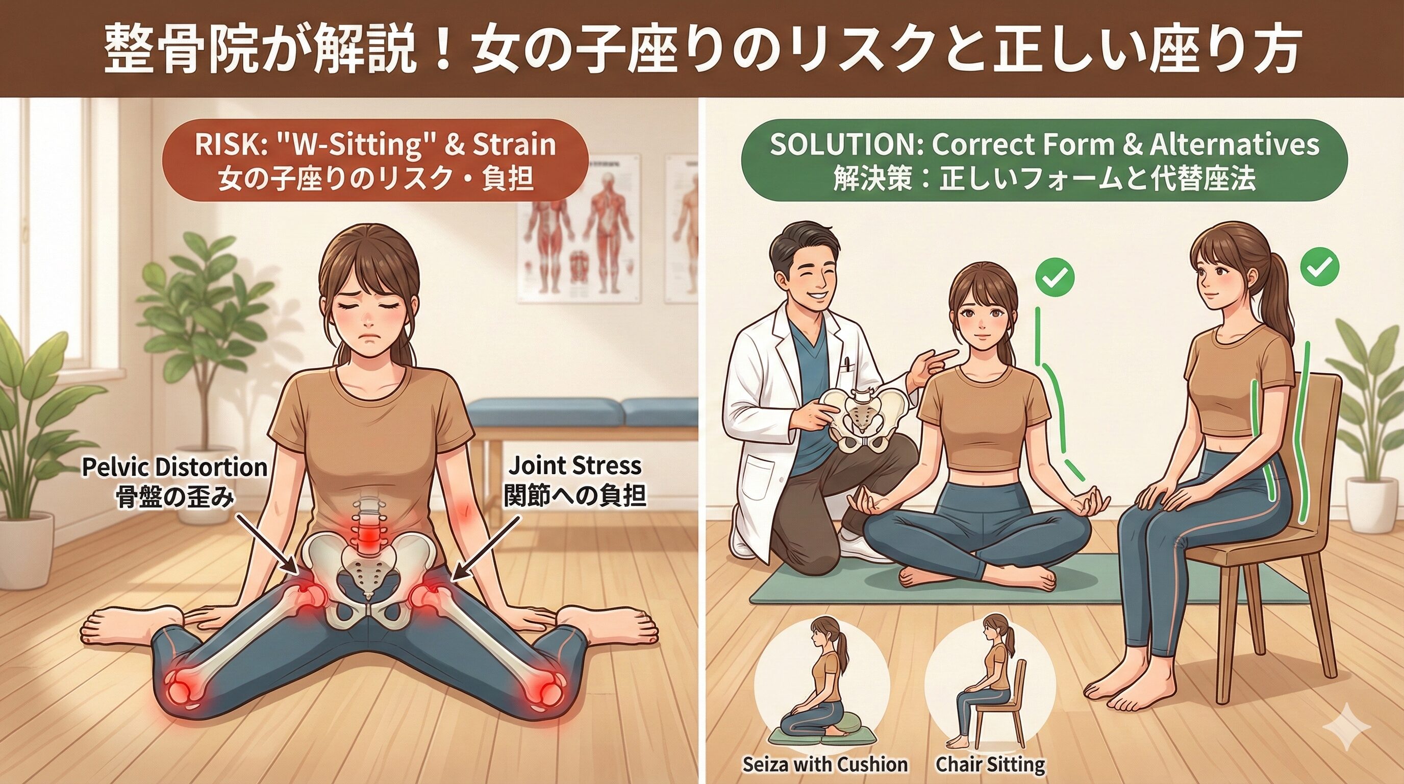 「後ろに脚を崩す女の子座り」は、一見リラックスして座れる姿勢に見えるけど、実は骨盤や体全体のバランスに負荷をかけやすい姿勢だと言われています。特に、骨盤が左右でアンバランスになったり、ゆがんだりしやすいという指摘があります。([turn0search0][turn0search6][turn0search4])