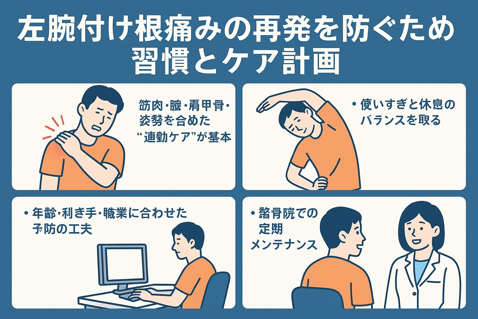 以上を押さえておくことで、「なんで左腕付け根が痛んでいるのか」「どの動きがマズいのか」「どこまで放っておいていいのか」が整理でき、次のステップ(原因特定・セルフケア・来院の判断)につながります。
