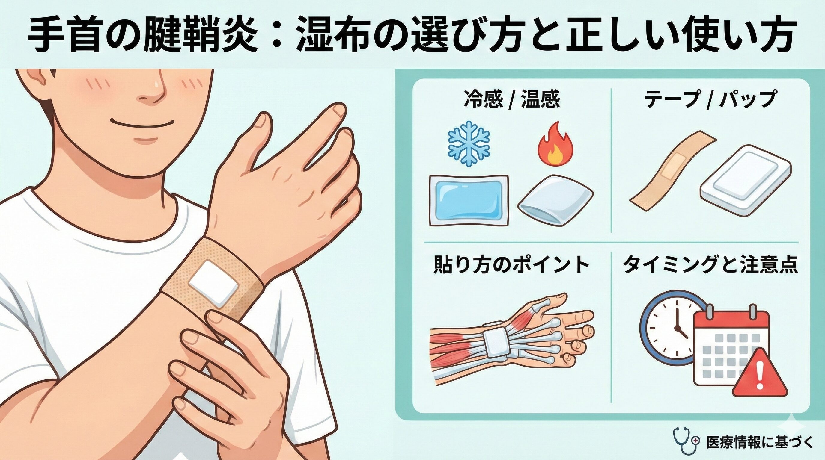 ただし、湿布だけで根本的な改善になるわけではなく、手首の使い過ぎを控える、安静にするなどの配慮と組み合わせることが大事、という医療機関のスタンスもあるようです。PMC+2Cleveland Clinic+2