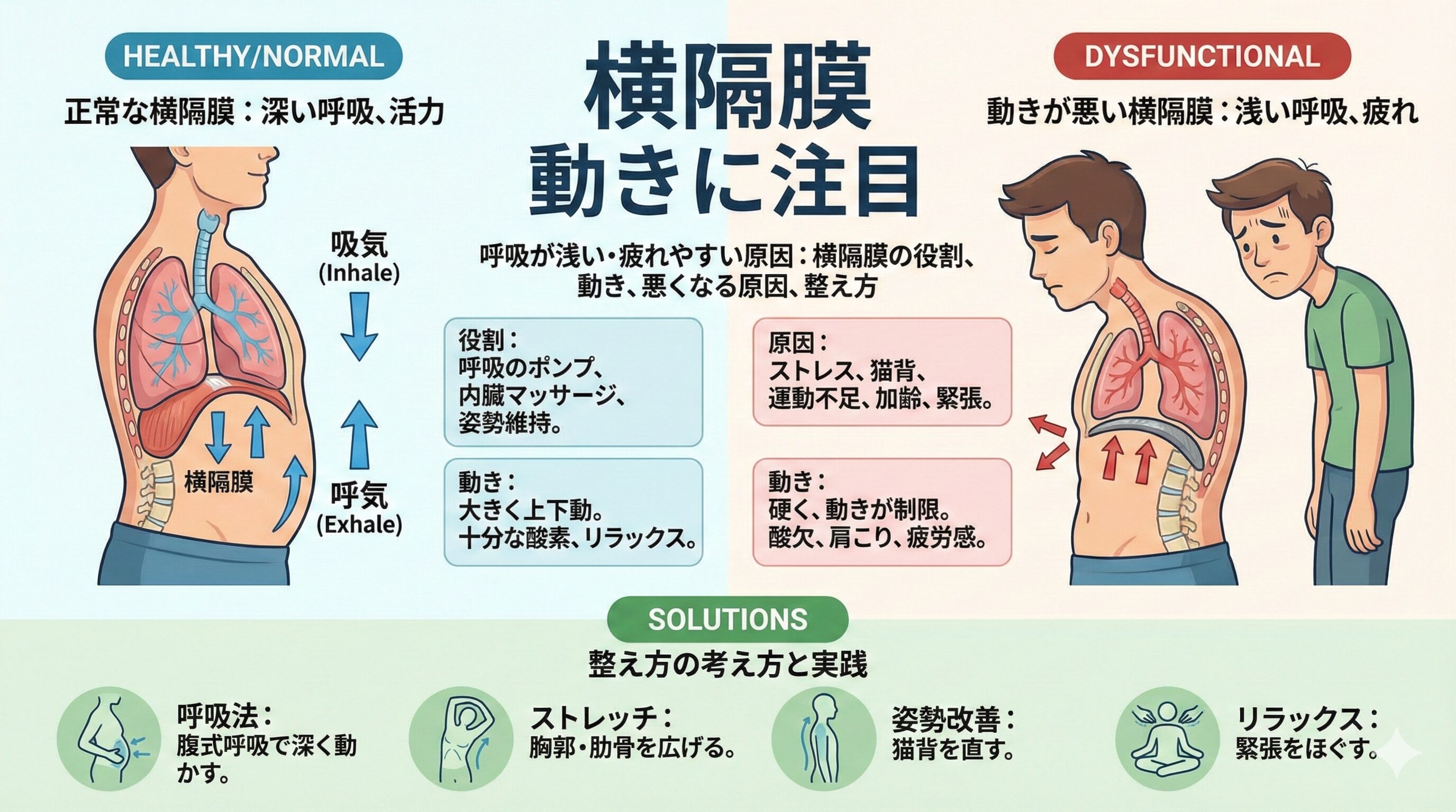横隔膜が上下にしっかり動かないと、空気を取り込む量が少なくなり、結果として呼吸が浅くなりやすいと考えられています。