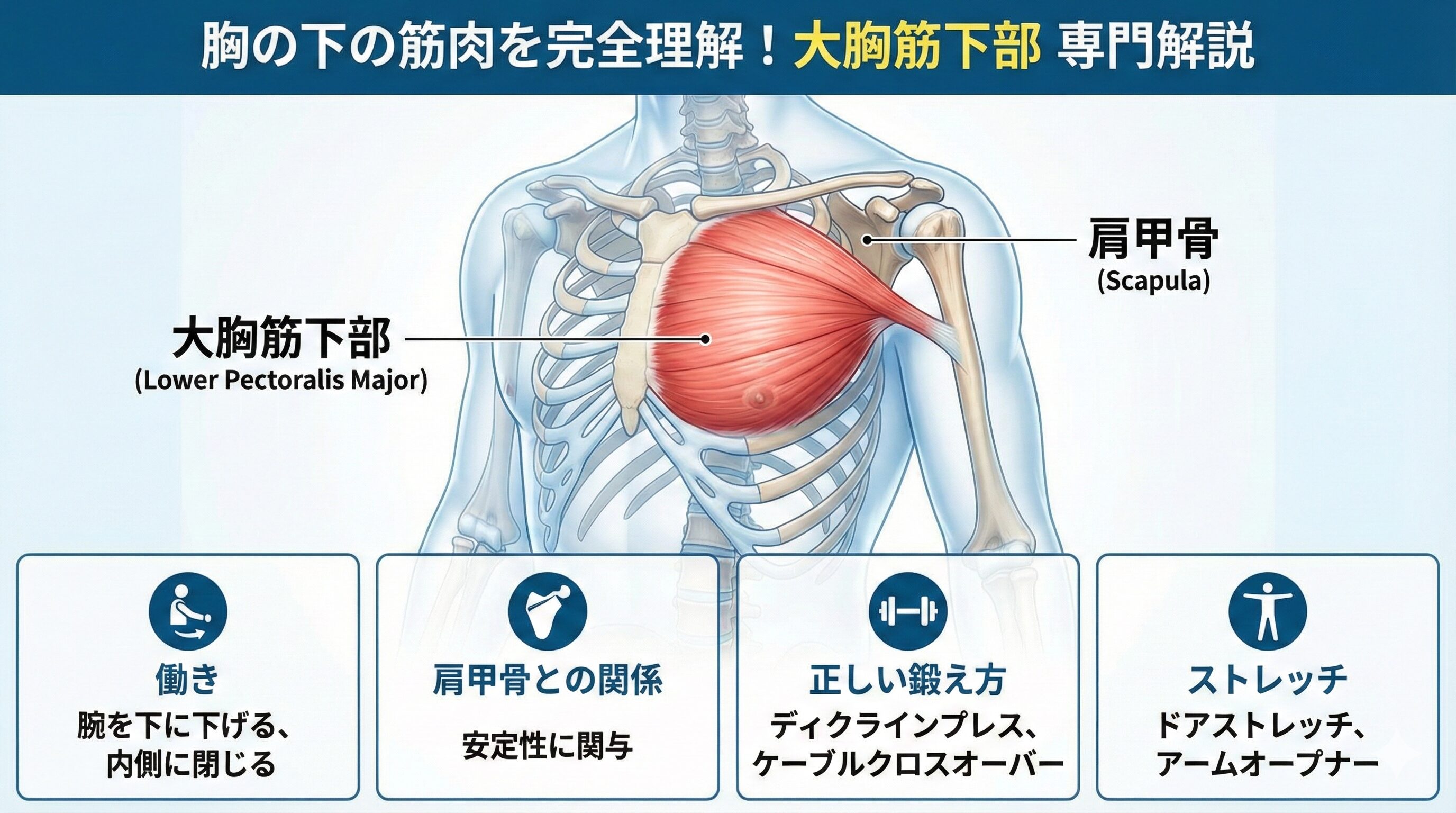また、大胸筋下部は内転と呼ばれる動きを担い、胸板の下側のライン形成に関与すると説明されています。